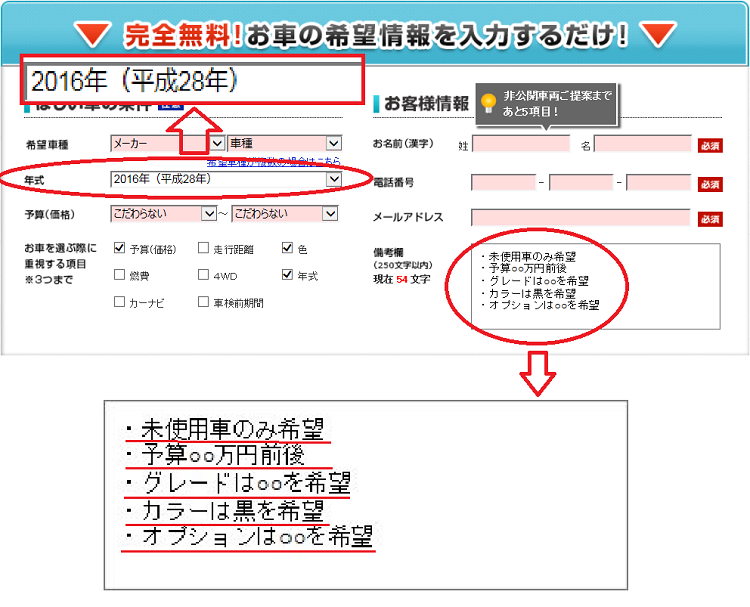 使い方もとてもかんたんです。↑の画像のように、「年式」を一番新しくして、「備考欄」に未使用希望、グレード希望、カラー希望、さらには希望するメーカーオプションなどを記入すればものの1分ほどで申請できます。